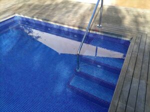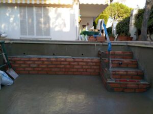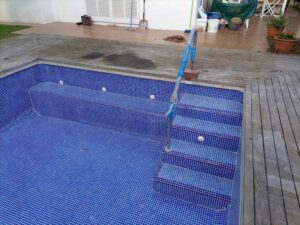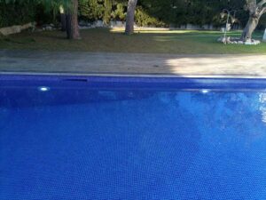 Piscina reformada completamente. Se retiró el gresite antiguo. Se modificó sistema de tuberías. Se construyó un banco y una escalera de obra. Se sanearon y cambiaron los dos focos existentes. Se impermeabilizó todo el vaso de la piscina y se alicató con gresite nuevo. Se instaló una barandilla de acceso.